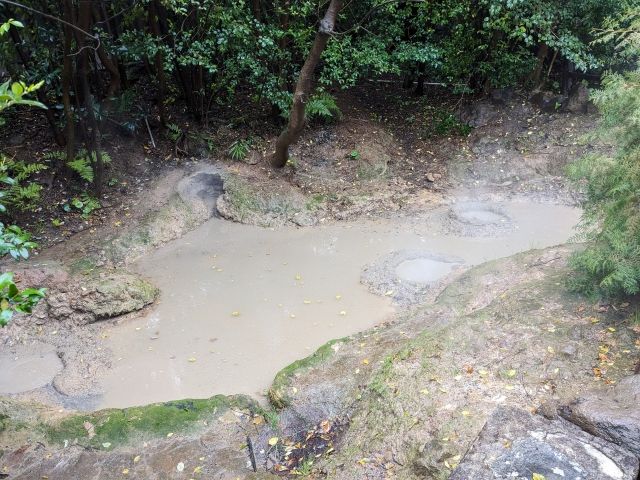 1丁目は熱泥地獄。地下にある岩盤が地熱によりできた様々な粘土が解けており、「坊主地獄」みたいなプールができあがっています。