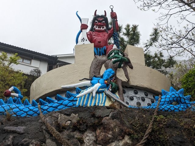 2丁目はシンボルの鬼さんが。改心してかまど地獄の門番になった八幡竈門神社の伝承の鬼であるそう。足元には青い龍神が見張っています。