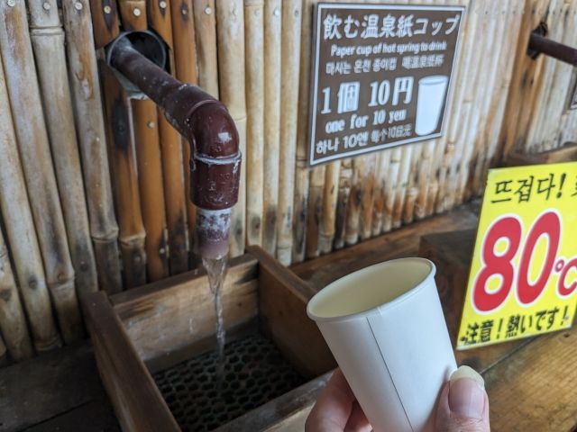 こちらは「飲む温泉」。10円の紙コップで温泉水を飲むことができます。温度は約80℃となかなか高温なので少しずつ冷ましながら飲まないとキケン。
