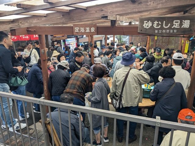 出口付近にも足湯があり、砂が入っているタイプのものもあるそう。体験してみたかったのですが、インバウンド客でぎっしり状態になっていました!