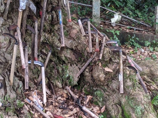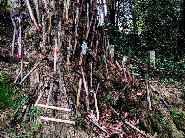 幹から根にいたるまでびっしりと鎌が刺さっております・・・!!!これまで多くの神社やお寺で様々な信仰のカタチを目にしてきましたが、これほどまでインパクトがあるのは初めて見ました。