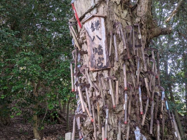 和歌山県にある鎌八幡宮の御神木にはハンディサイズの草刈鎌がびっしり・・・!禍々しい呪いに見える光景ですが、実際のところそういった意味ではないそう。いったいどんな目的で打ち込まれているのでしょうか?