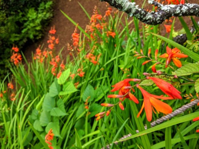 オレンジ色の花はヒオウギズイセン。小さな花がたくさんでにぎやかな印象です。