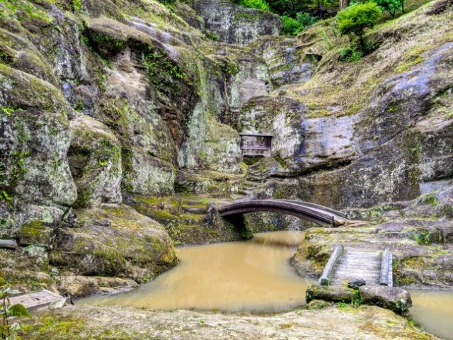 岩肌がむき出しの崖が迫る、迫力ある光景。岩盤を削り出して作り上げたこの独創的な庭園は「岩庭」と呼ばれることもあるそう。