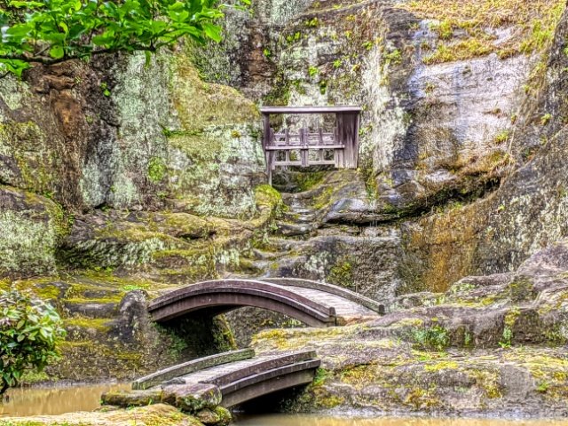 2つの木の橋と、その先にある木戸も雰囲気を引き立てます。見る人に流れを作る働きを持っているのではないでしょうか。