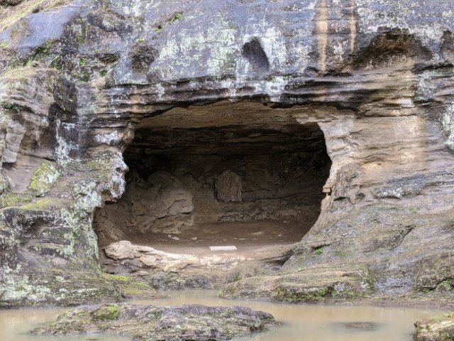 ぽっかりと空いた大きな穴は天女洞。鎌倉には「やぐら」と呼ばれる岩をくり抜いた洞窟が多数存在していますが、その中でもかなり大きい部類。この洞窟は修行の場であったそう。