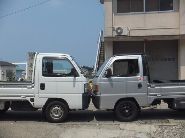 完全に接触している軽トラック。何がおこってこのような停車をしているのでしょうか・・・。これも離島ならではの光景ですかね?