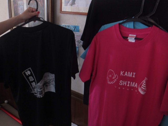 神島のTシャツを来ている人がいたので尋ねてみたところ、山海荘(さんかいそう)というところでグッズ販売があるらしい。こちらが神島Tシャツ。1枚3,500円くらいかと思いきや、なんと1,800円!しかも、化学繊維で出来た速乾タイプは1,200円という破格の値段!(※2018年8月時点)