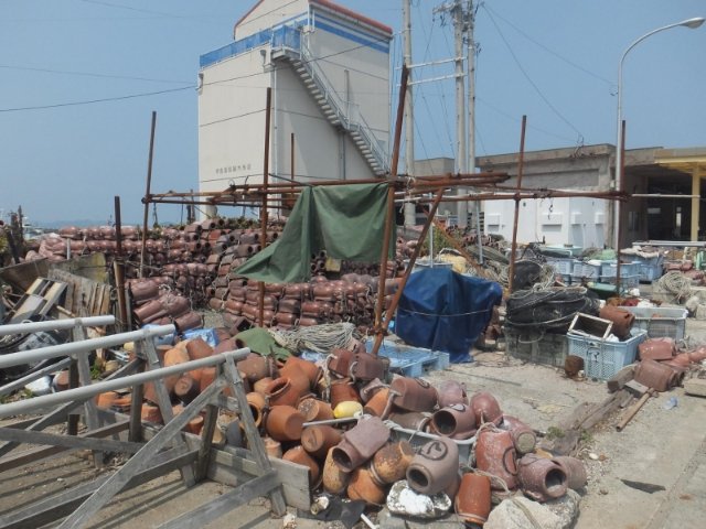 落ち着いたのでちょっと港周辺をさんぽ。積み重なった謎の容器、こちらはタコ壺に違いない!そして、港にはウェットスーツを着たおばさんたち。海女の文化がしっかり根付いているんですね。