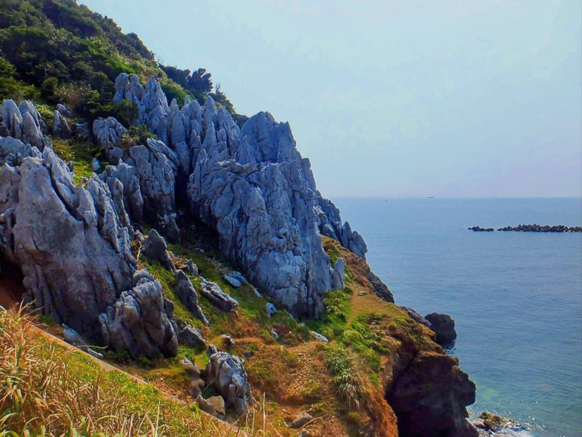 集落とほぼ反対側あたりに差し掛かると、島の名所であるカルスト地形が広がります。緑と茶色の山肌にむき出しになった白い石灰石。なんとなく怪我して骨が見えちゃったみたいで痛そうな地形です。