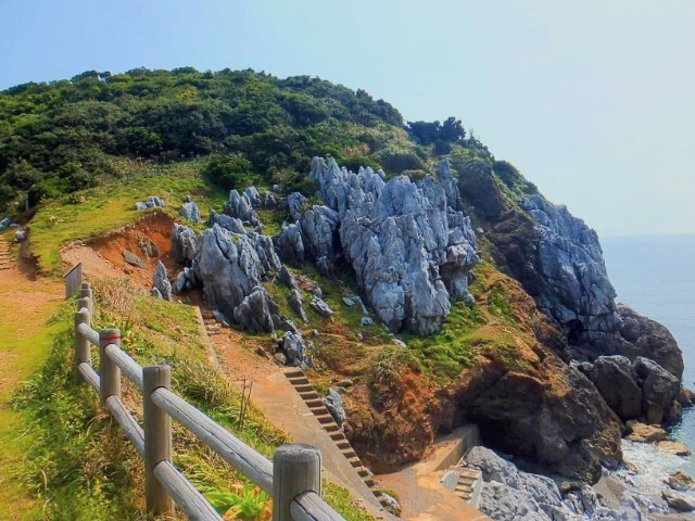 この道を回避するには、カルスト地形近くの学校から車道を進めば何とかなりそうです。私は海辺の景色につられて進んだがために、クマゼミ地獄に陥りました。