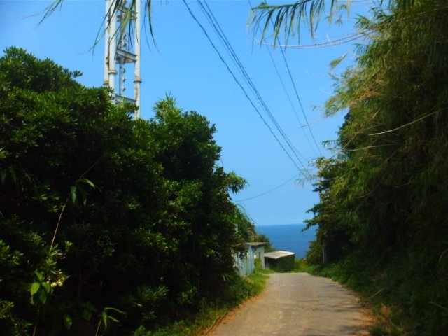 港までは舗装された下り坂。これまでの試練が嘘のように快適な道です。青い空と青い海は、まるで沖縄の離島に来たような気分。