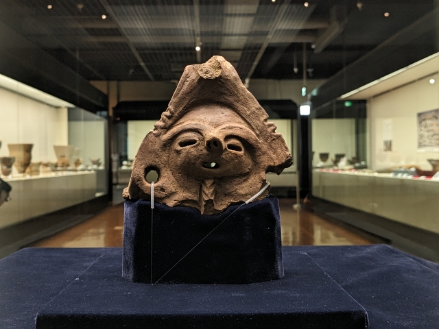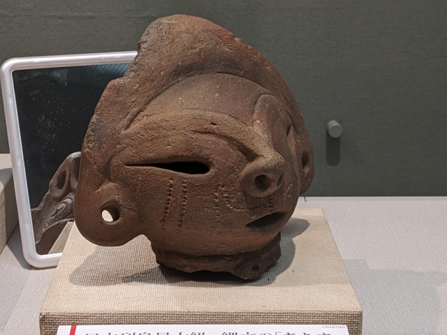続いて両面顔面把手。座間市の蟹ヶ澤遺跡より出土したもの。その名の通り、反対側にも同じような顔が作られています。令和四年10月と、最近発見されたばかりのものとのこと。