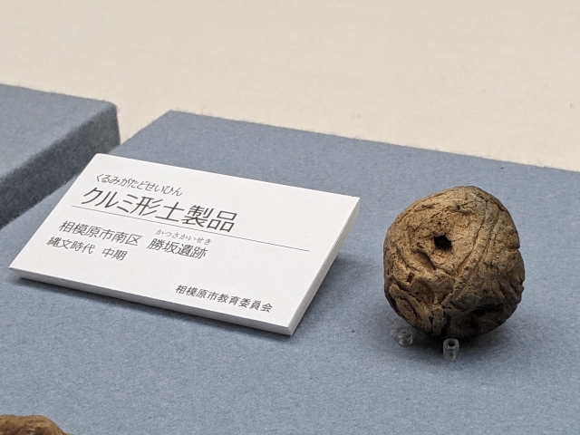 ユニークなのが、クルミ形の土器。クルミのようなカタチをした器から、そのままクルミを再現したかのような土製品まで、様々な作品が作られています。クルミが身近なモチーフであったことがわかるラインナップです。