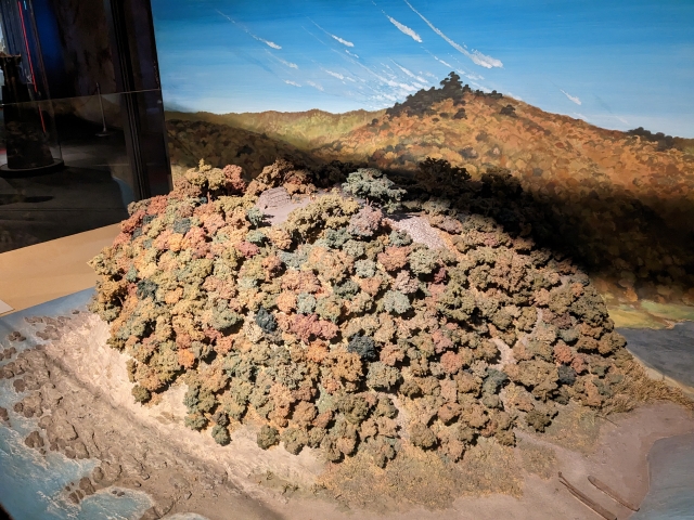縄文時代の集落のジオラマ。横須賀市にある茅山貝塚を参考に、台地に造られた集落が再現されています。よく見ると一角には、ゴミ捨て場である貝塚も。