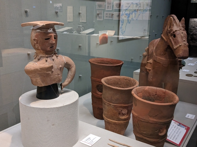古墳時代のハニワもいくつか展示されています。人物埴輪、馬形埴輪、円筒埴輪と、いずれも神奈川県内の古墳より出土したものです。