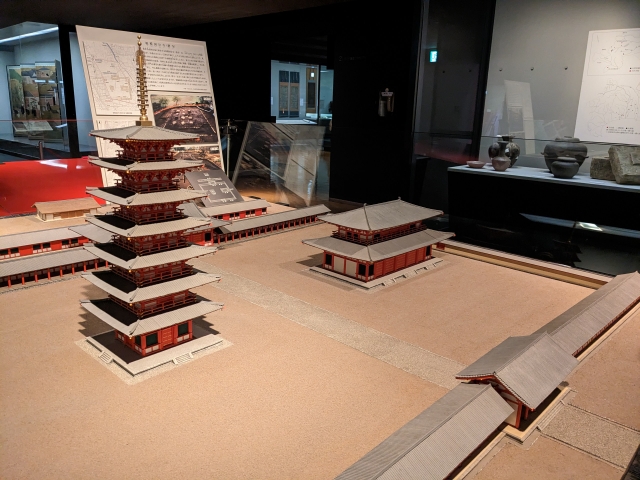 こちらは中世の相模国分寺(僧寺)復元模型。左に塔、右に金堂、正面奥に講堂が並ぶ法隆寺式伽藍配置となっています。