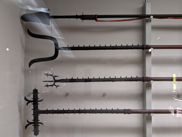 江戸時代に入ると、神奈川県は東海道の宿場町として川崎、藤沢、小田原、箱根などが栄えていきます。関所三道具といわれたのが、こちらの「突棒(つくぼう)・刺叉(さすまた)・袖搦(そでがらみ)」。目立つところに置いて、通行人が違反しないように見張っていたそうです。