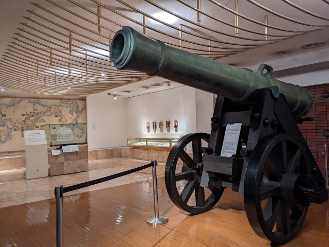 唐突に現れる巨大な大砲。こちらは「青銅80ポンド陸用カノン砲」のレプリカ。頻繁に訪れるようになった異国船を撃退するため、江戸幕府が品川台場に設置していたものだそう。