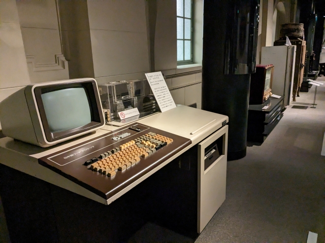 近代コーナーには、昔の家電も展示されています。冷蔵庫、足踏み式ミシン、テレビなどレトロなものがラインナップ。手前のレトロフューチャーなものは日本語ワードプロセッサ。キー配列が現代とほとんど一緒ですね!