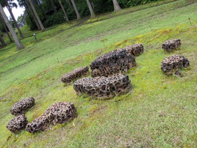 遠くから見ると、まるで公園に設置された椅子とテーブルの様にも見える作品。穴だらけの陶器がたくさん並んでおり、土器や土偶といった原始美術のを連想させられます。穴の中ではコケが育っており、作品が自然の中で成長していく様子を感じます。