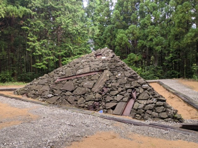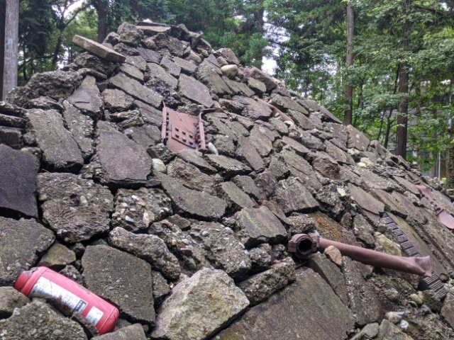 野面積みの瓦礫でできたピラミッド。よく見ると、鉄パイプや消火器など様々なものが組み込まれています。