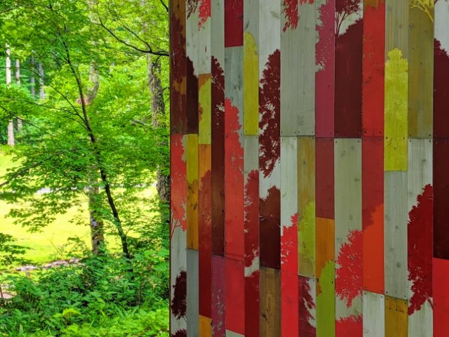 森の緑と反対色である暖色中心の色合いで染められた小屋。よく見ると、壁面には木々のシルエットが描かれています。
