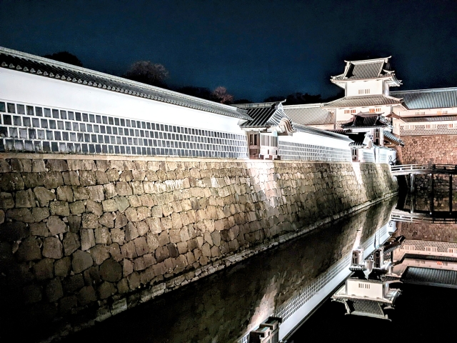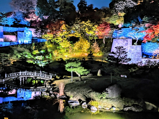 必見なのは玉泉院丸庭園のライトアップ。通常のライトアップに加えて、音と光の演出もあります。橋や池、そして積み上げられた石垣が鮮やかなカラー照明で彩られ、なんとも幻想的な光景。