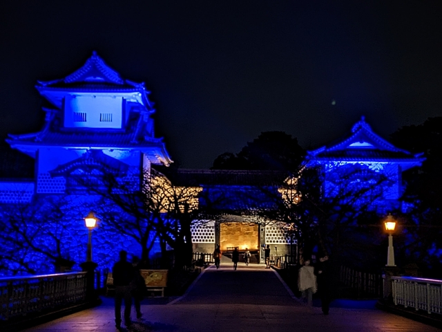 金沢城公園では、一年を通してほぼ毎日ライトアップを開催しています。11月に訪問したところ、石川門は世界糖尿病デー(11/14)に関連してブルーに輝いていました。