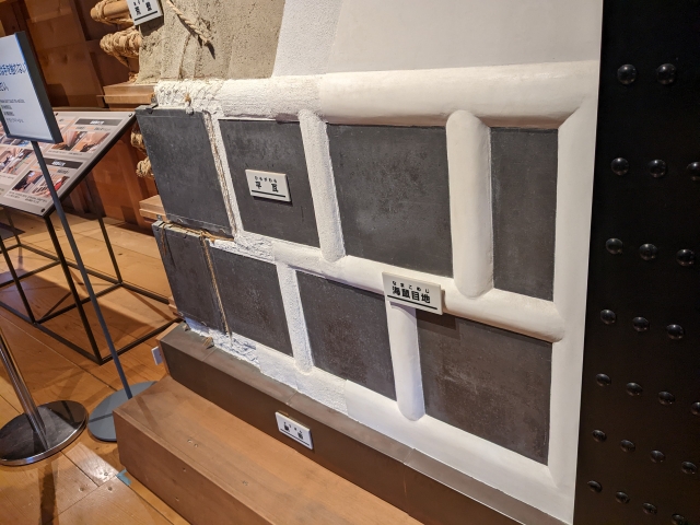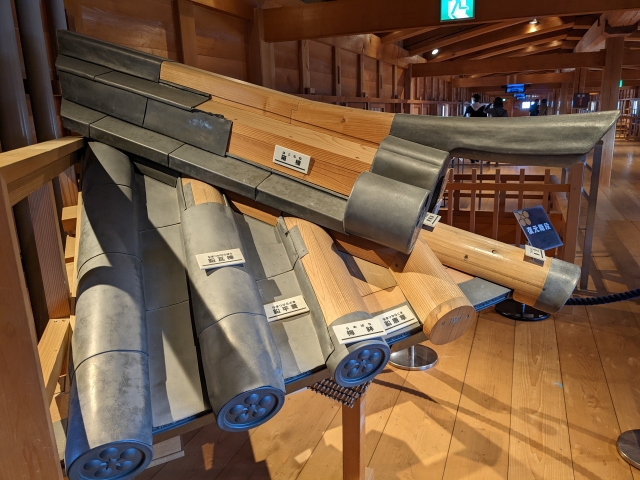 2001年に木造で復元されたものであるため、館内はとってもきれい。ちょっとした歴史紹介パネルはありますが、お城恒例の鎧兜や歴史資料などはほぼありません。その代わり紹介されているのは金沢城の建築。屋根は木材に鉛板を張り付けた「鉛瓦葺き」。積雪に耐え得る軽量な瓦であると同時に、鉄砲の弾へと転用が可能となっています。