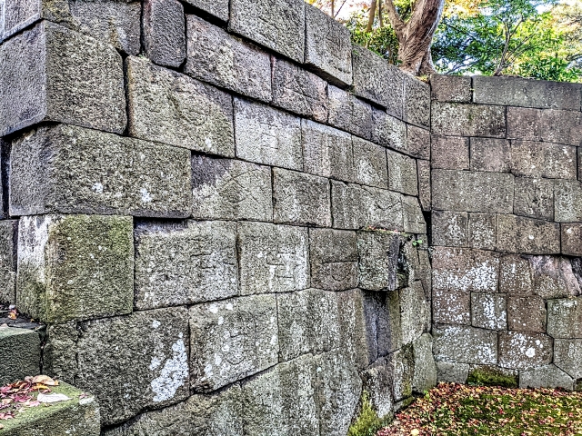 たくさんの刻印が見られる「数寄屋敷(すきやしき)石垣」もなかなかユニーク。まるで象形文字のような文様は、作業分担のために付けられたといわれています。