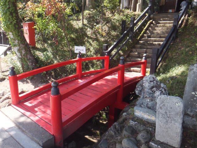 昭和54年の発掘調査の際に、全部で50段の石段が存在したことがわかりました。この赤い橋の下には、35段・高さにして約6mが埋没しているのです。