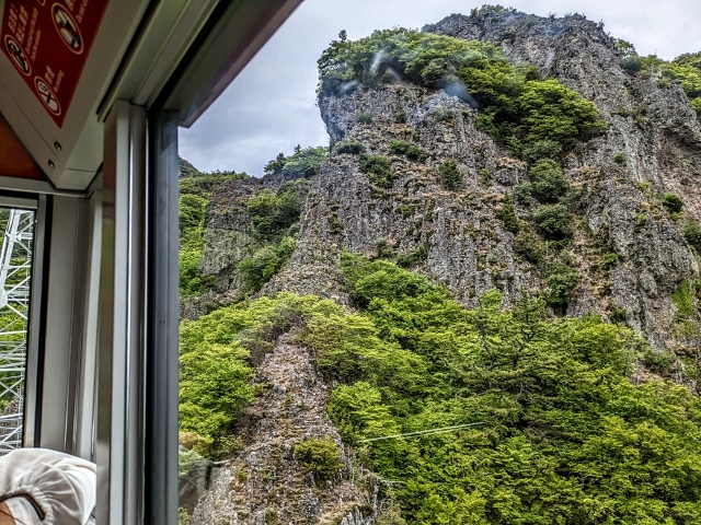 こううん駅を出発したゴンドラはぐんぐんと上昇していきます。窓の外には巨大な岩の壁が見えてきました!
