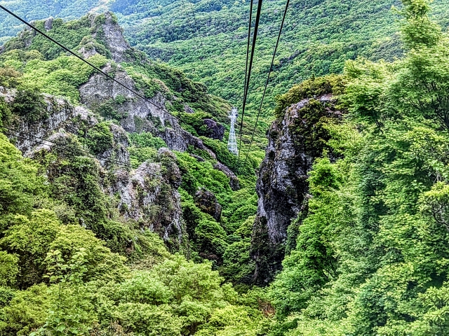 山頂までの移動手段、くらいの軽い気持ちで乗車したため、思った以上の演出にびっくり。岩の間に立てられた支柱とそこから延びるロープからも、その軌道のエキサイティングさが伝わるのではないでしょうか。