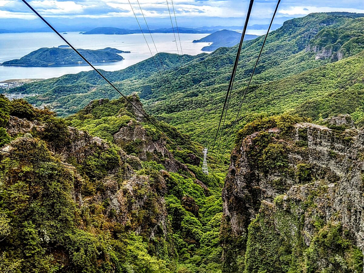そんな寒霞渓で空中散歩が楽しめるのが寒霞渓ロープウェイ。中腹にある「こううん駅」から「山頂駅」まで、全長917m・高低差312mをわずか5分で駆け上がります。