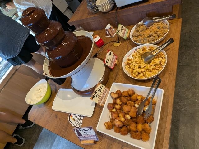ビュッフェレストラン定番のチョコフォンデュもあります。マシュマロとサーターアンダギーがそばにありますが、パインに付けても美味しそう。