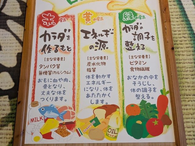 「赤色」は体をつくるもとタンパク質・無機質、「黄色」はエネルギーの源は炭水化物・脂質、「緑色」は体の調子を整えるビタミン・食物繊維とのこと。