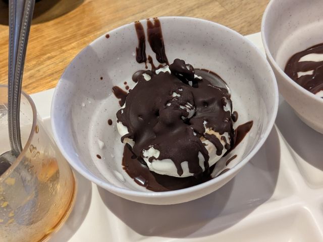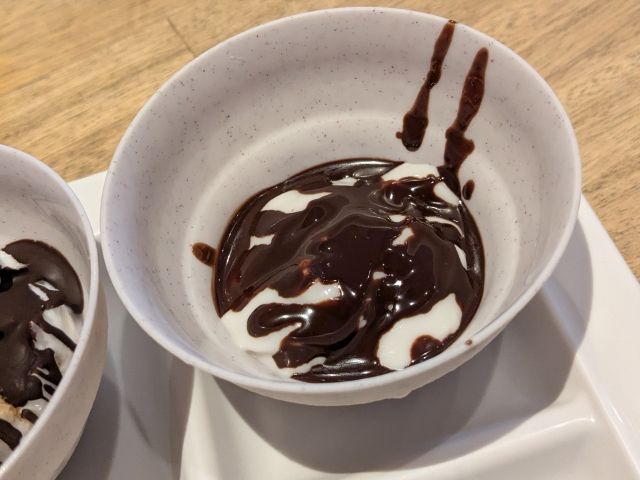 アイスのフォンデュチョコがけ!!!チョコソースとは異なり、フォンデュチョコはアイスの冷たさで徐々にパリパリになっていきます。