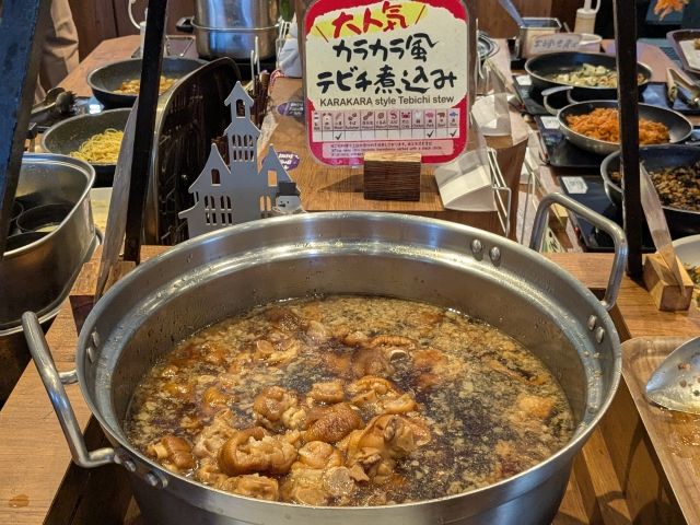 大鍋で煮込まれているのはテビチ。豚足を煮込んだ沖縄の郷土料理です。とろっとろに煮込まれててとっても食べやすい!甘じょっぱいお味はご飯が進みます。