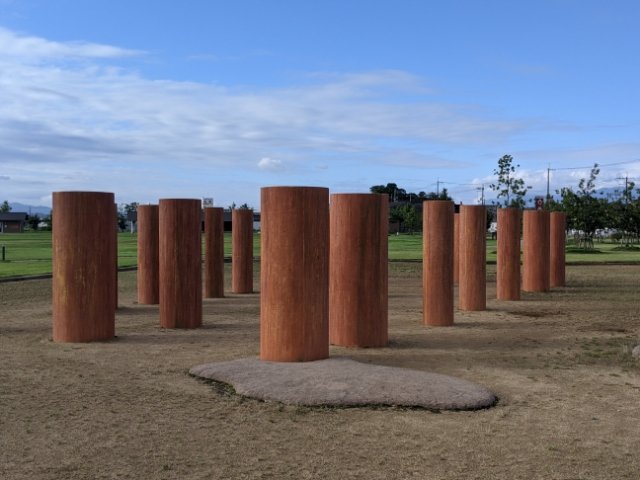 こちらのずらりと並んだ丸太のようなものは大型建物跡。かつてここには、大きな建築物が建てられていました。発掘調査の際には、直径60cmのケヤキの柱も出土しており、この丸太はその柱をイメージして設置されています。