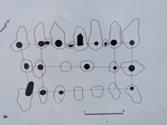 近くの案内板では、発掘された礎石と柱の並びを示した図も掲載されています。また、園内にある遺構展示情報館では、柱穴を形取りして再現した模型も展示しているそうです。