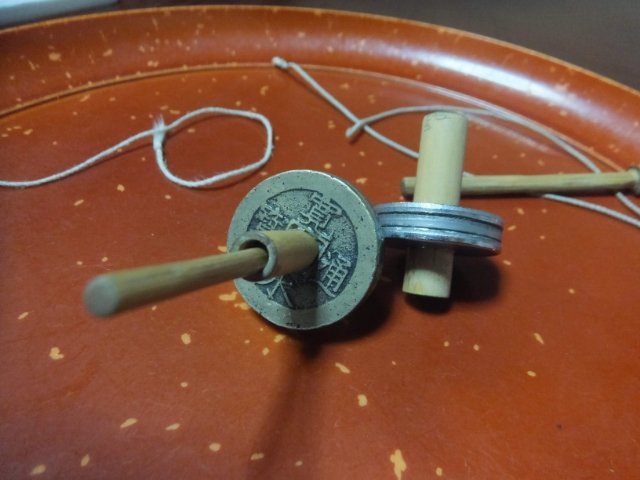 銭に軸が付けられた「銭独楽(ぜにごま)」。対戦して遊ぶことができますが、そもそも上手く回すのが難しいため泥試合になりがちです。