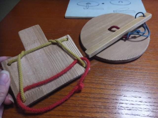 板にヒモがかかった謎の物体。こちらはなんと「知恵の輪」。赤いひもの輪っかを取り外すのですが、めっちゃ難しいです!私には無理でした。