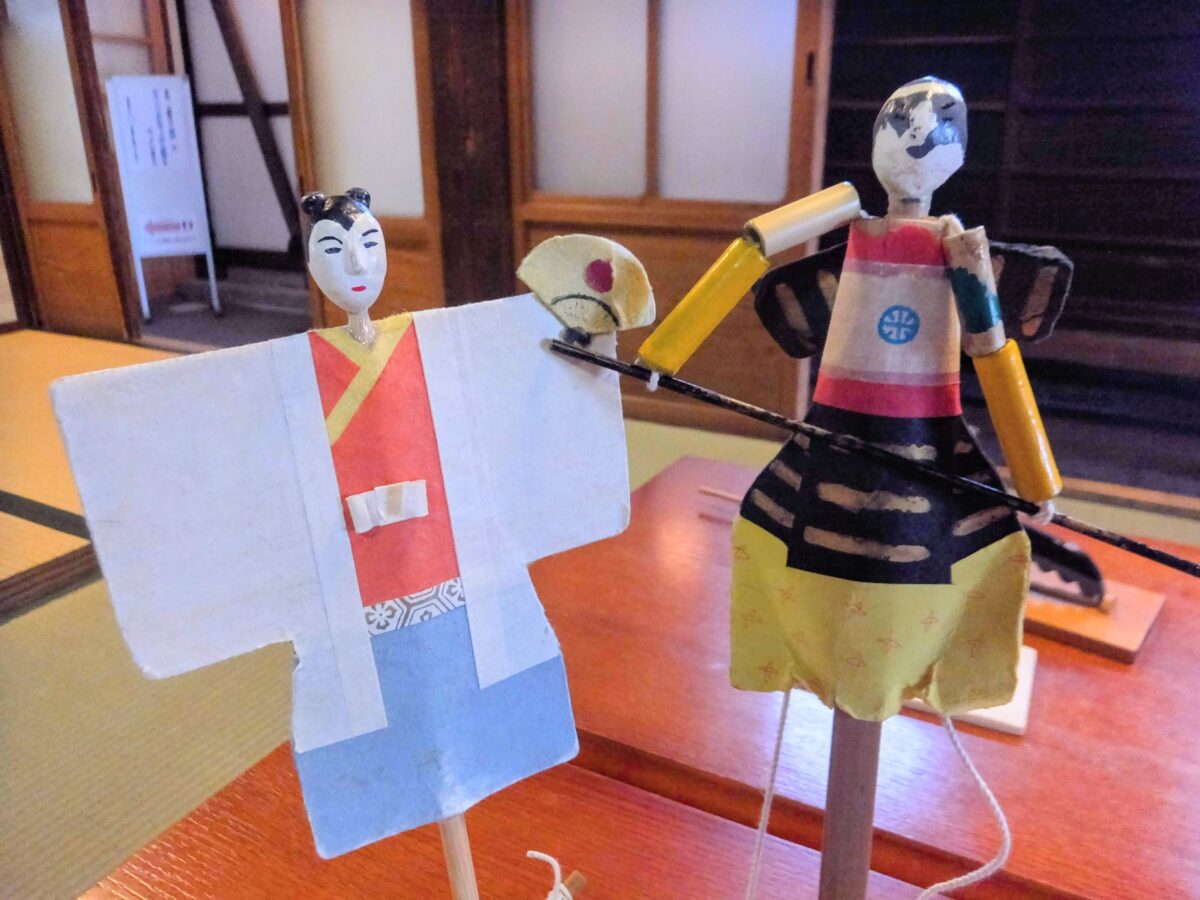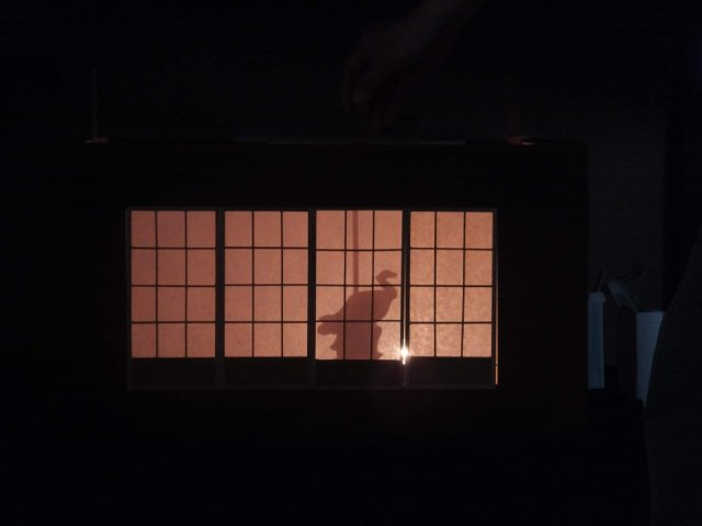しかし、実際は人が道具や衣服を使ってシルエットをつくっているのでした。昔の人々は、障子に映る自身の影で様々なカタチを作って遊んでいたそうです。その様子を再現した影絵でした。