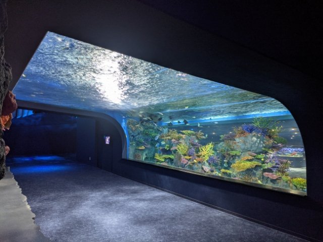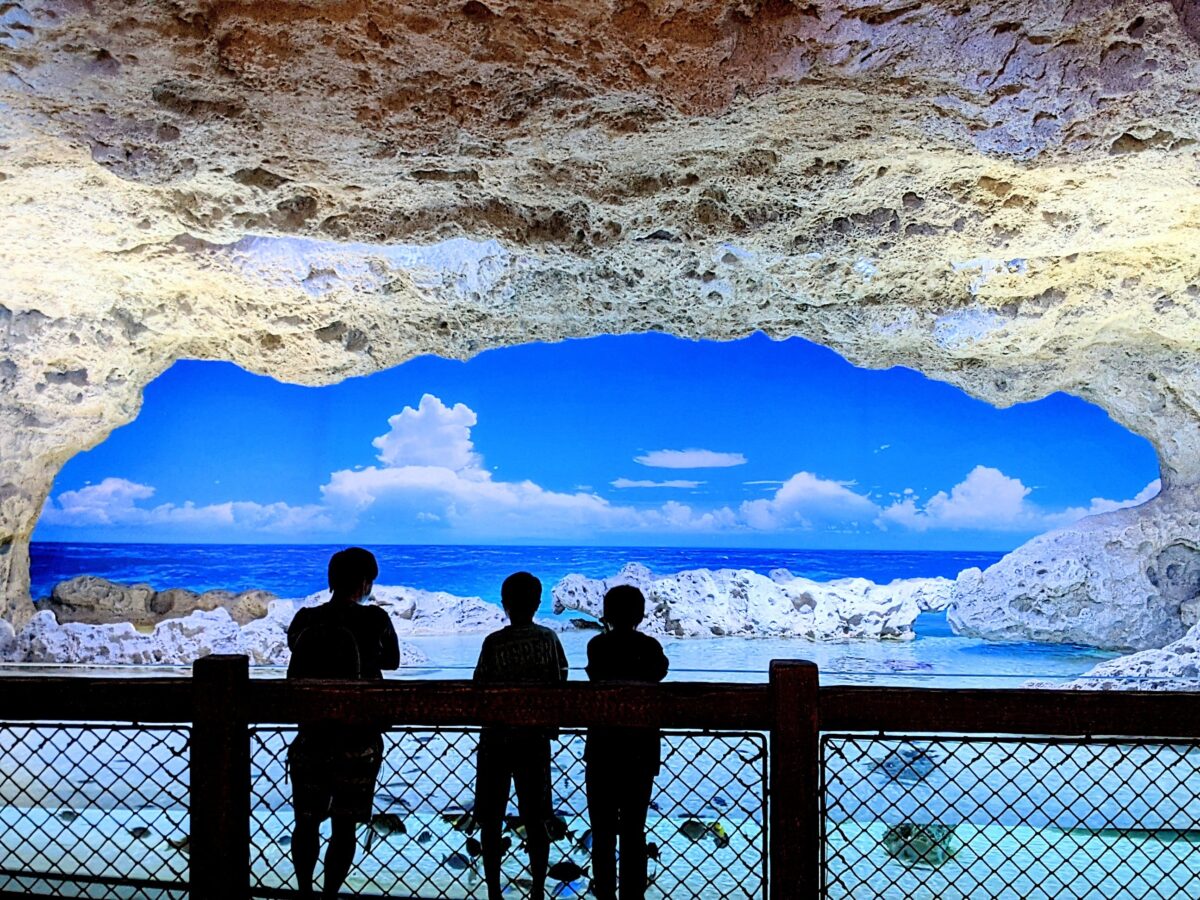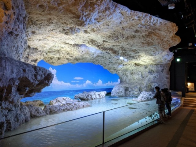 いろいろな水槽がある中でも圧巻なのはトンネル形の水槽「ちゅらさんリーフ」。海蝕洞穴のようなデザインの大きな水槽で、この水族館のシンボルとも呼べる存在感。