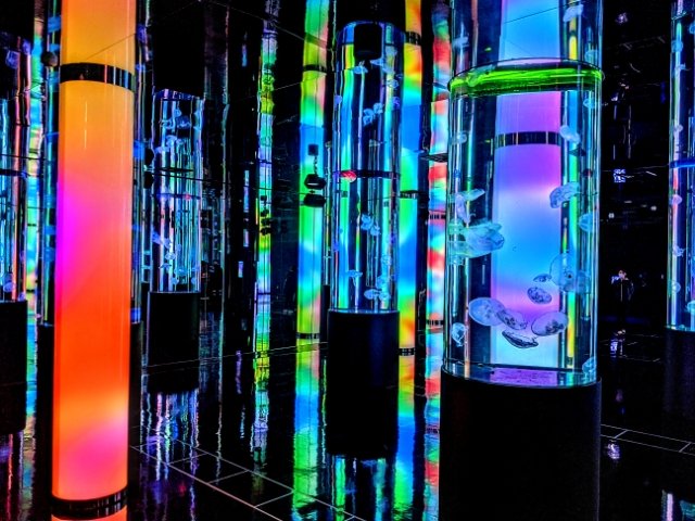 カラフルな照明の「クラゲよんなー」。アンビエントなBGMの中で、ミズクラゲがふわりふわりと泳ぐリラックス空間。特に写真映えする空間です。