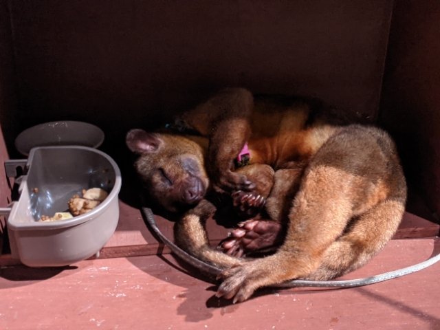こちらの不思議な動物はキンカジュー。キツネザルのようにも見えますが、実はアライグマの仲間であるそう。夜行性なので、ただひたすら寝ています。