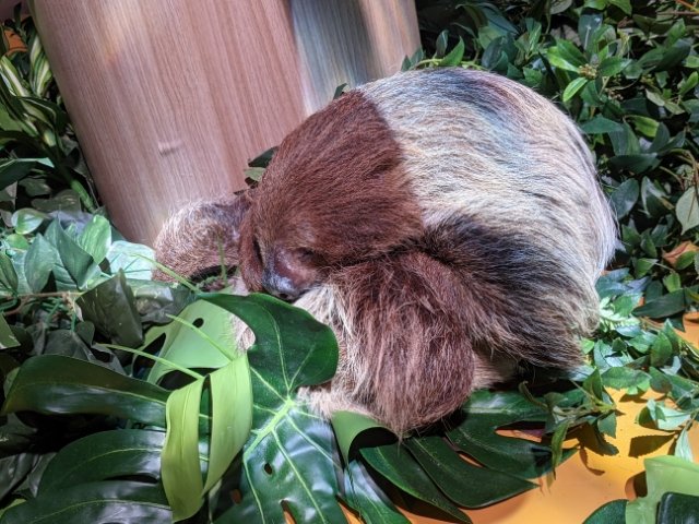 まんまるなフタユビナマケモノ。1日に15〜20時間は寝ているそうなので、まったく動きません。起きている姿を見れたらかなりラッキー!