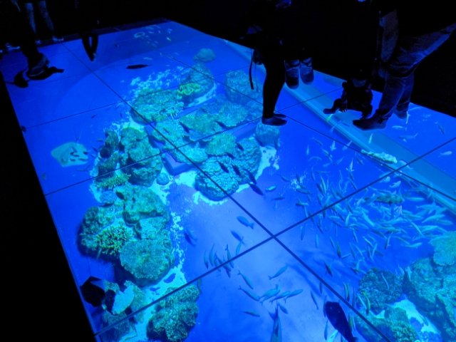 こちらは水槽の上を歩けるコーナー。真っ暗な部屋に青く輝く美しい水槽はデジタル映像ではありません!先ほどの大水槽の上にガラスが張られており、水の上を歩いているような不思議な感覚が楽しめるのです。また、ここへ入る際は靴を脱いで裸足になるため、ひんやりしたガラスのなんともいえない気持ち良さもポイントです。