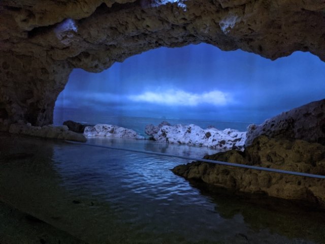 打ち寄せる波の音と、壁に映し出されたひろーい大海原の映像で臨場感たっぷり。この映像と照明は少しずつ変化していきます。ぼんやりと眺めていたところ分厚い雲が発生し、ゴウゴウと雷雨が響き渡りました。
